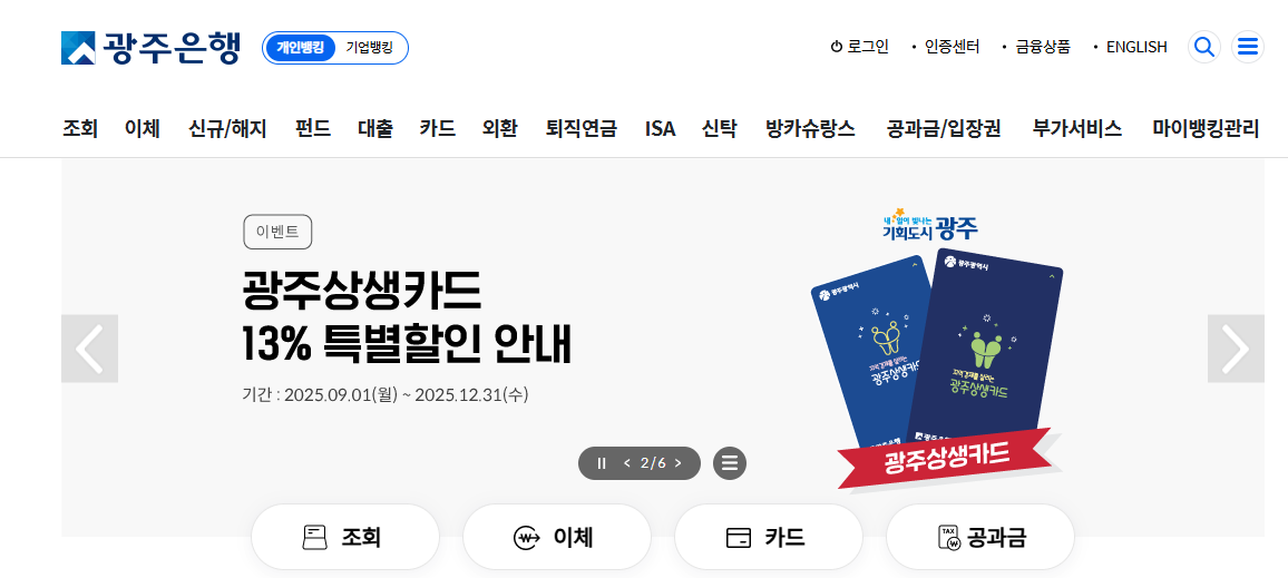 광주은행 카드 홈페이지 서비스란