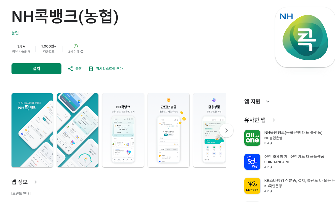 - 설치: 농협에서 제공하는 공식 앱(개발자: NH) 확인 후 '설치' 버튼 클릭